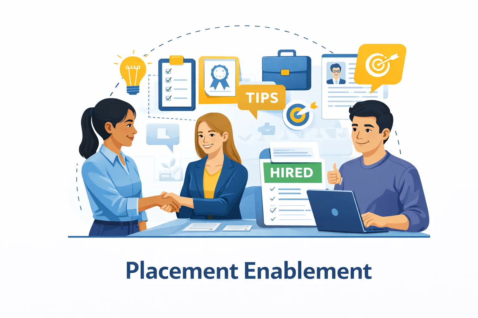 Stay placement-ready with structured support designed around real interview needs. Our placement framework bridges the gap between learning and selection through practical guidance and outcome-driven preparation.